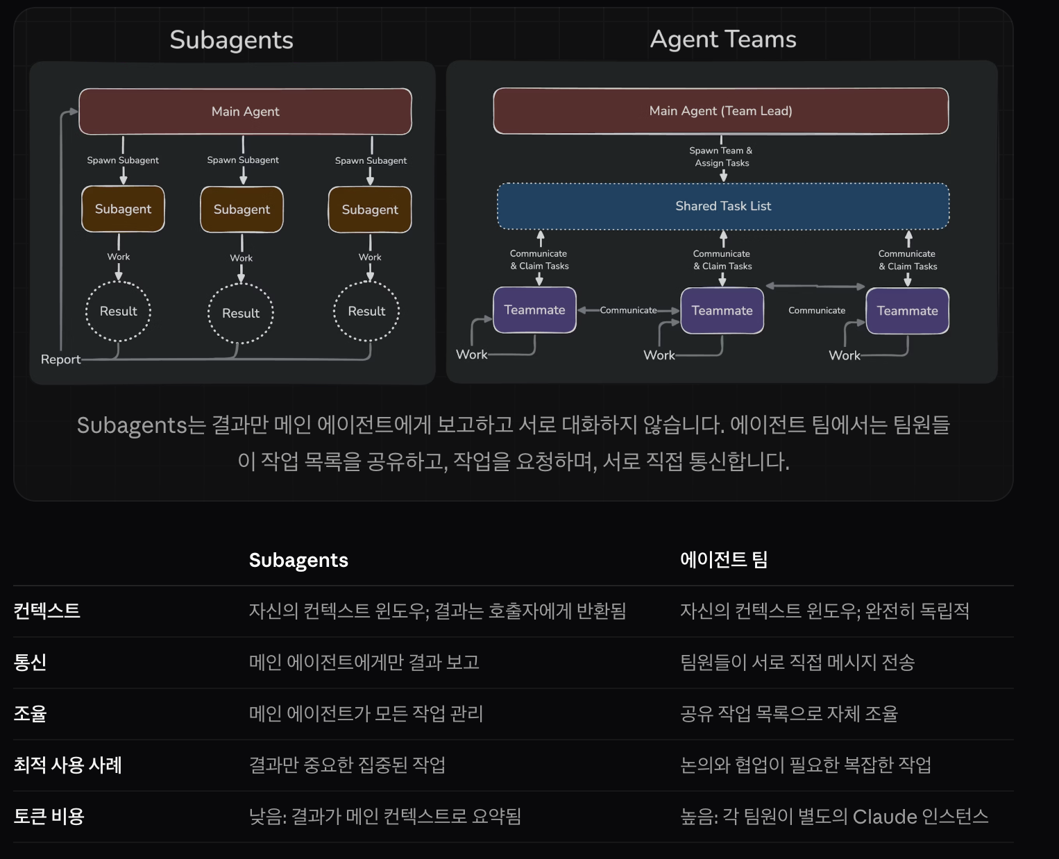 - 팀원들: 할당된 작업에서 각각 작동하는 별도의 Claude Code 인스턴스