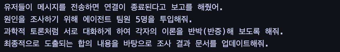 - 근본 원인이 불명확할 때, 단일 에이전트는 그럴듯한 설명 하나를 찾고 멈추는 경향이 있다. 적대적으로 동작하는 팀원을 하나 만들어 이를 방지한다.