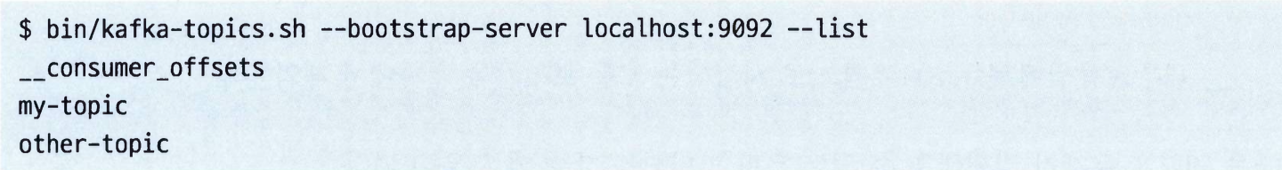 명령을 사용해서 클러스터 안의 모든 토픽을 보여준다.- 이떄 출력되는 결과는 한 줄에 하나의 토픽이며, 특정한 순서는 없다.