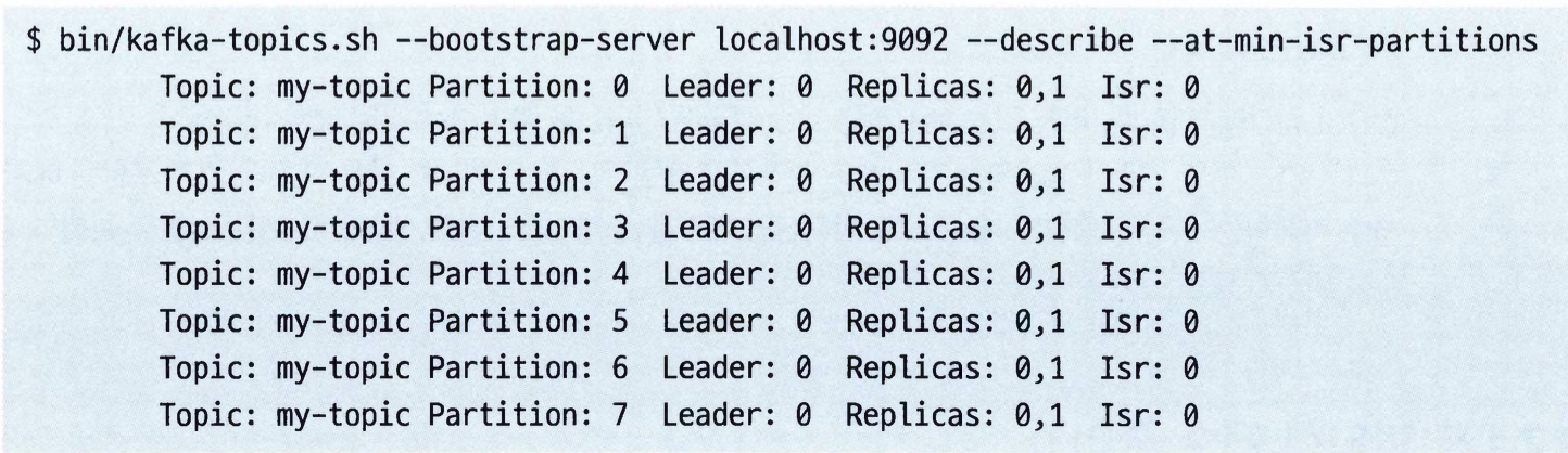 : 레플리카 수(리더 포함)가 인-싱크 레플리카 최소값과 같은 모든 파티션을 보여준다. 이 토픽들은 프로듀서나 컨슈머 클라이언트가 여전히 사용할 수 있지만 중복 저장된 게 없기 때문에 작동 불능에 빠질 위험이 있다.--under-min-isr-partitions