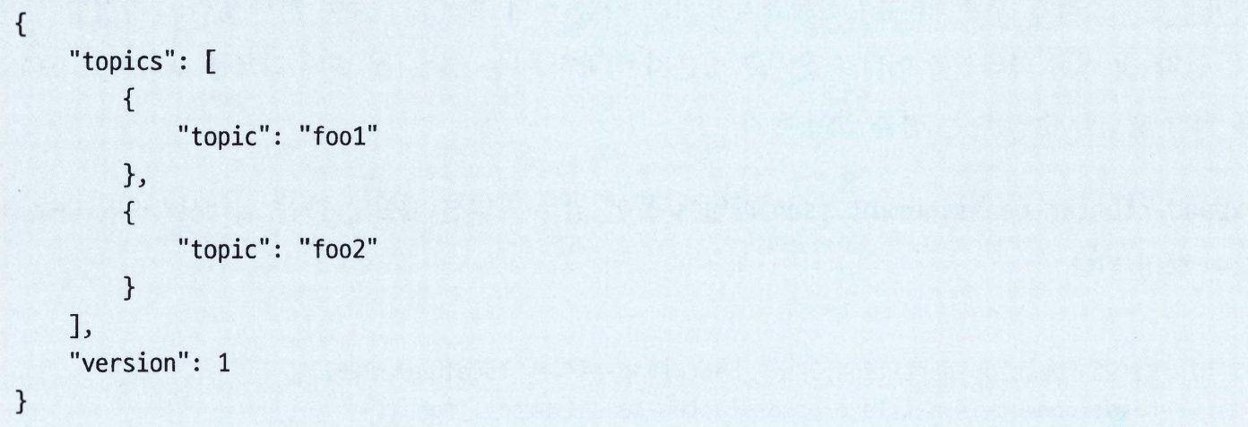 - 이동시킬 파티션 목록을 생성하기 위해서는, 우선 토픽 목록을 담은 JSON 객체를 포함하는 파일을 생성해야 된다.