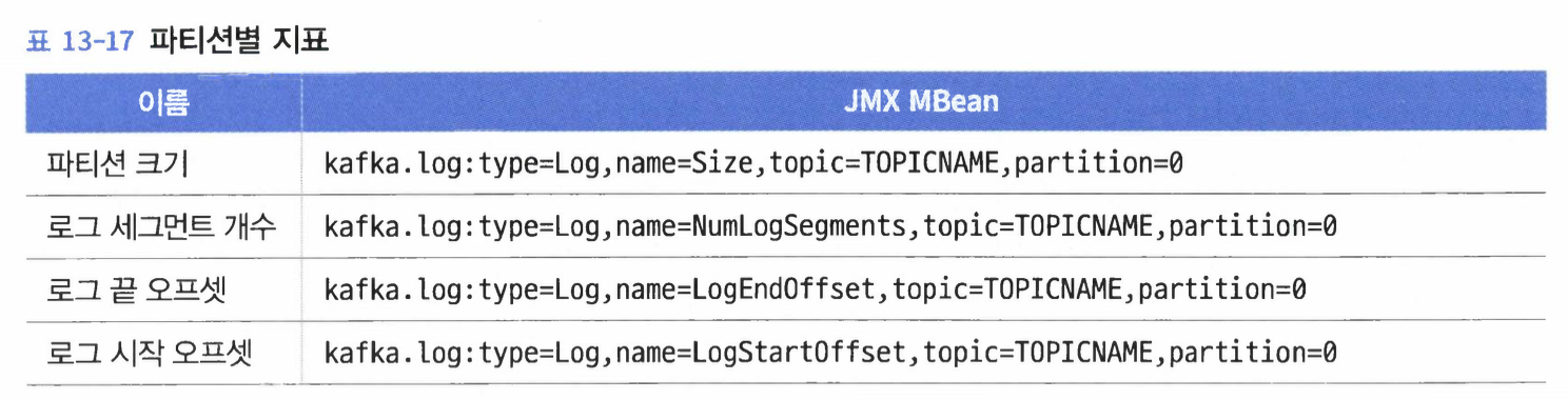 - 문제 진단을 위한 메트릭: 파티션의 개수, 리더 파티션 수, 전 토픽에 있어서의 초당 들어오는 메시지, 전 토픽에 있어서의 초당 들어오는 바이트, 전 토픽에 있어서의 초당 나가는 바이트