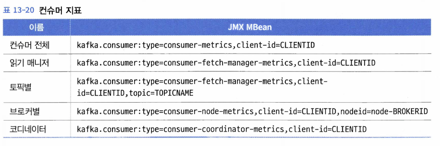- 프로듀서 클라이언트와 마찬가지로, 컨슈머 클라이언트 역시 브로커 연결이나 읽는 토픽에 각각에 대한 지표를 제공한다.