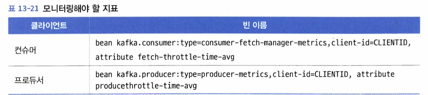 - 카프카 브로커에 쿼터 기능은 기본적으로 활성화되어 있지 않다. 하지만 지금 쿼터를 사용하고 있는지의 여부와는 상관없이 이 지표들을 모니터링하는 것이 안전하다.