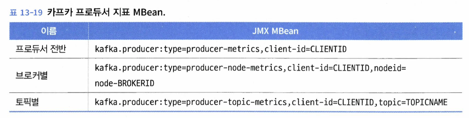 - 애플리케이션 지표: 카프카 그 자체의 JMX 인터페이스에서 나온 지표