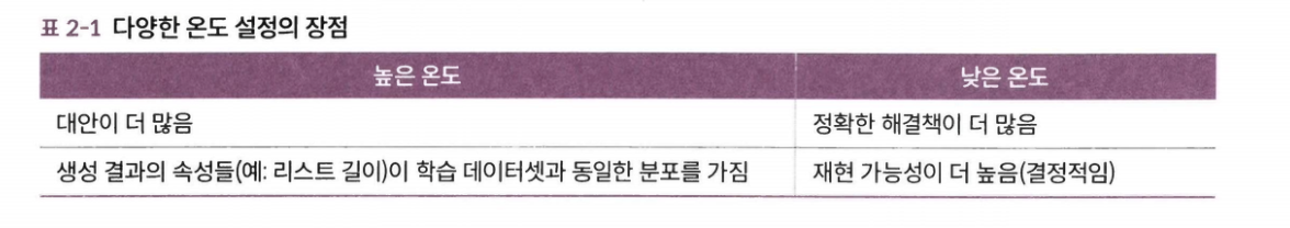 - 0: 항상 가장 가능성이 높은 토큰을 사용한다. 0으로 설정하면 LLM은 결정적인 모델에 가까워진다.