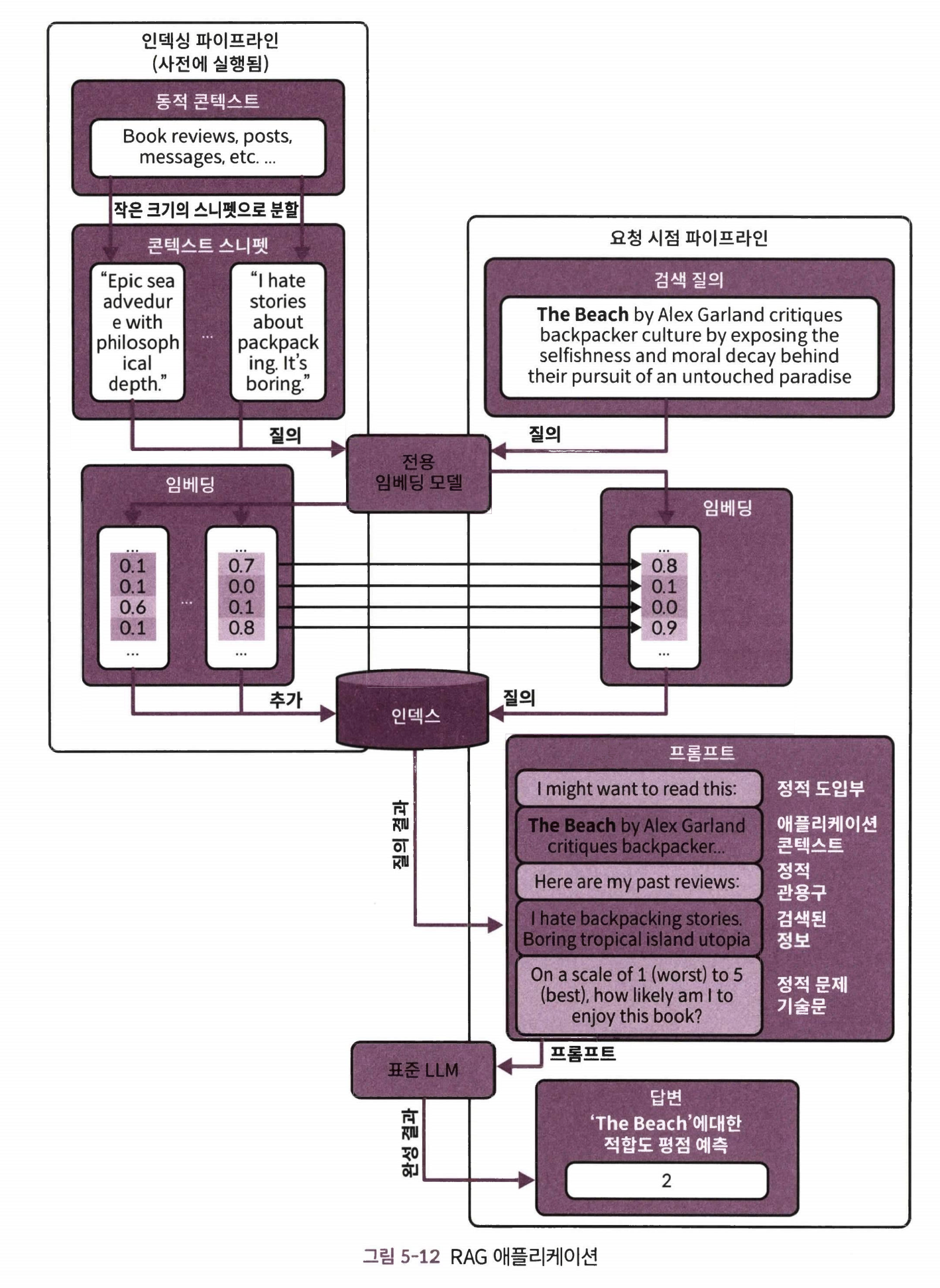 - RAG의 핵심적인 요소는 검색이다. 정리되지 않은 방대한 양의 정보를 조사해 관련 내용을 선별하여 콘텍스트에 포함시켜야 할 때 거치는 과정이다.