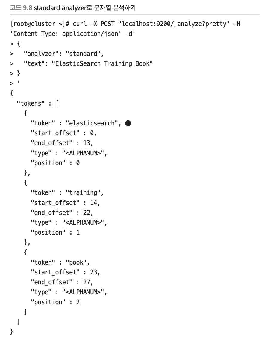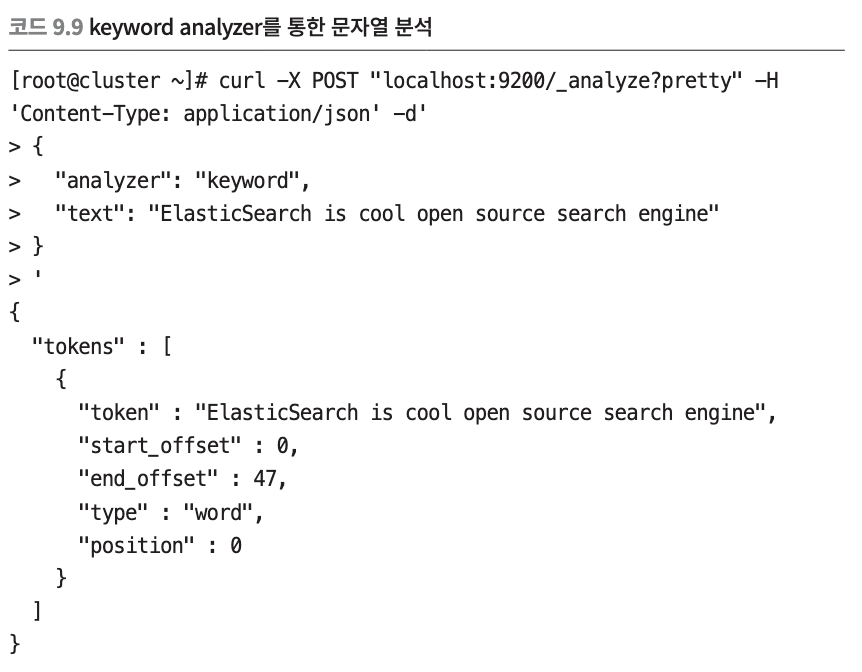 - analyzer는 운영 중에 동적으로 변경할 수 없기 때문에 analyzer를 바꿀 경우 인덱스를 새로 만들어서 재색인해야 한다는 점을 기억하자.