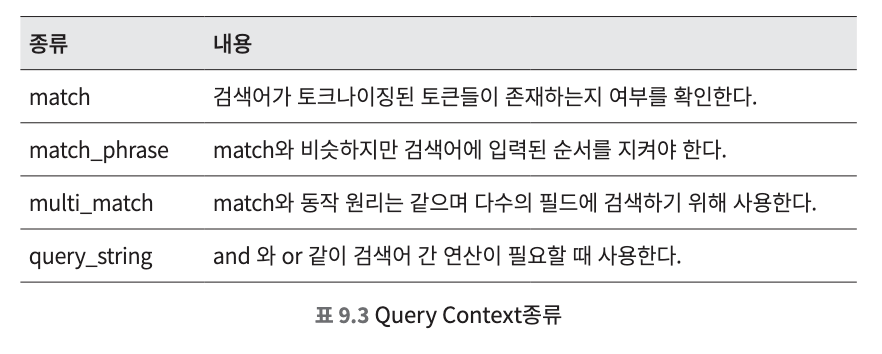 - Query context: Full text search를 의미하며, 검색어가 문서와 얼마나 매칭되는지를 표현하는 score라는 값을 가진다.