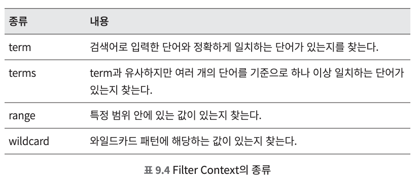 - FIlter context: 검색어가 문서에 존재하는지 여부를 Yes나 No 형태의 검색 결과롤 보여준다. score 값을 가지지 않는다.