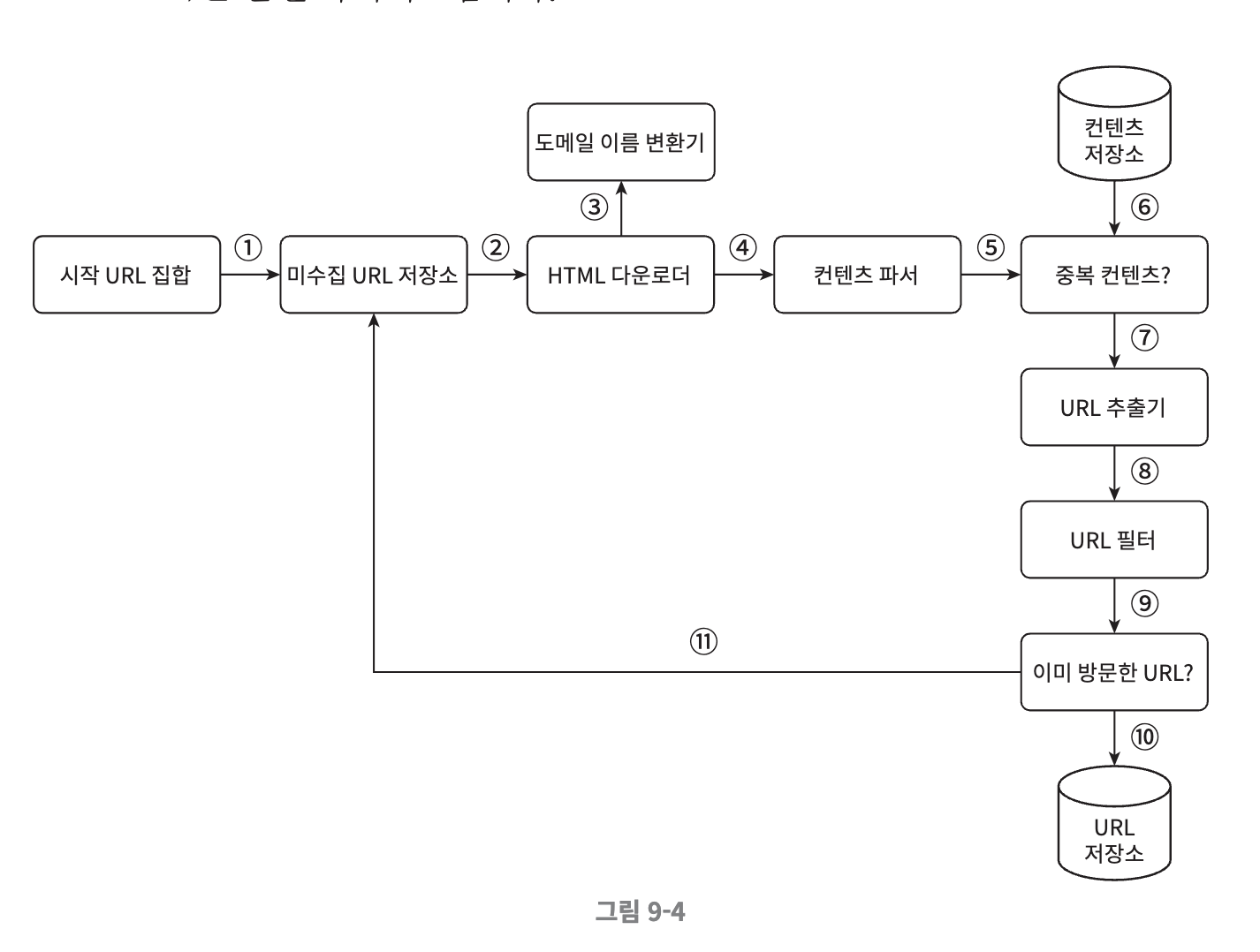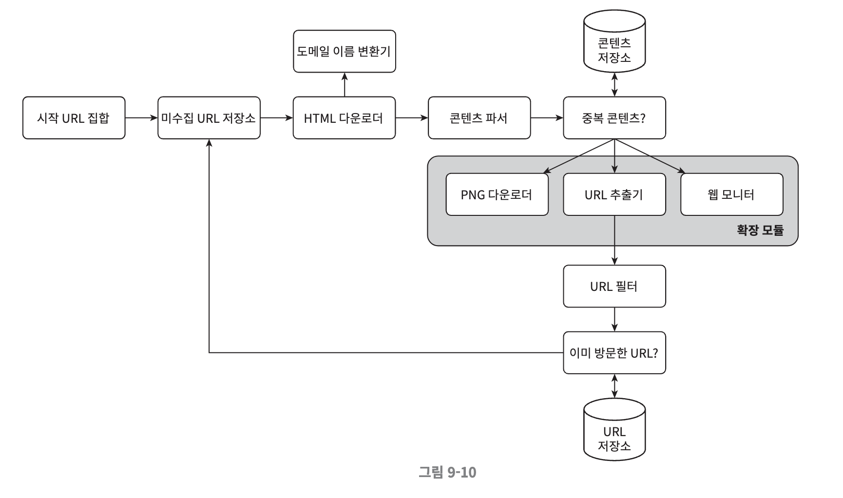 - 크롤링 상태 및 수집 데이터 저장: 장애가 발생한 경우에도 쉽게 복구할 수 있도록 크롤링 상태와 수집된 데이터를 지속적 저장장치에 기록해 두는 것이 바람직하다.
